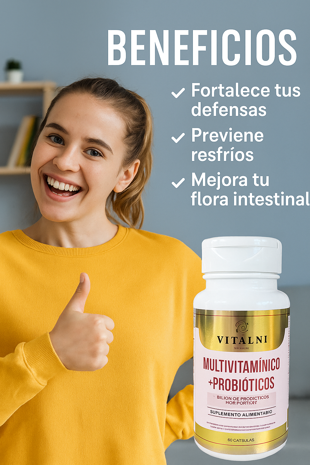 No esperes a sentirte débil. Protege tu salud, potencia tu energía y equilibra tu digestión con este completo multivitamínico + probióticos de calidad superior.